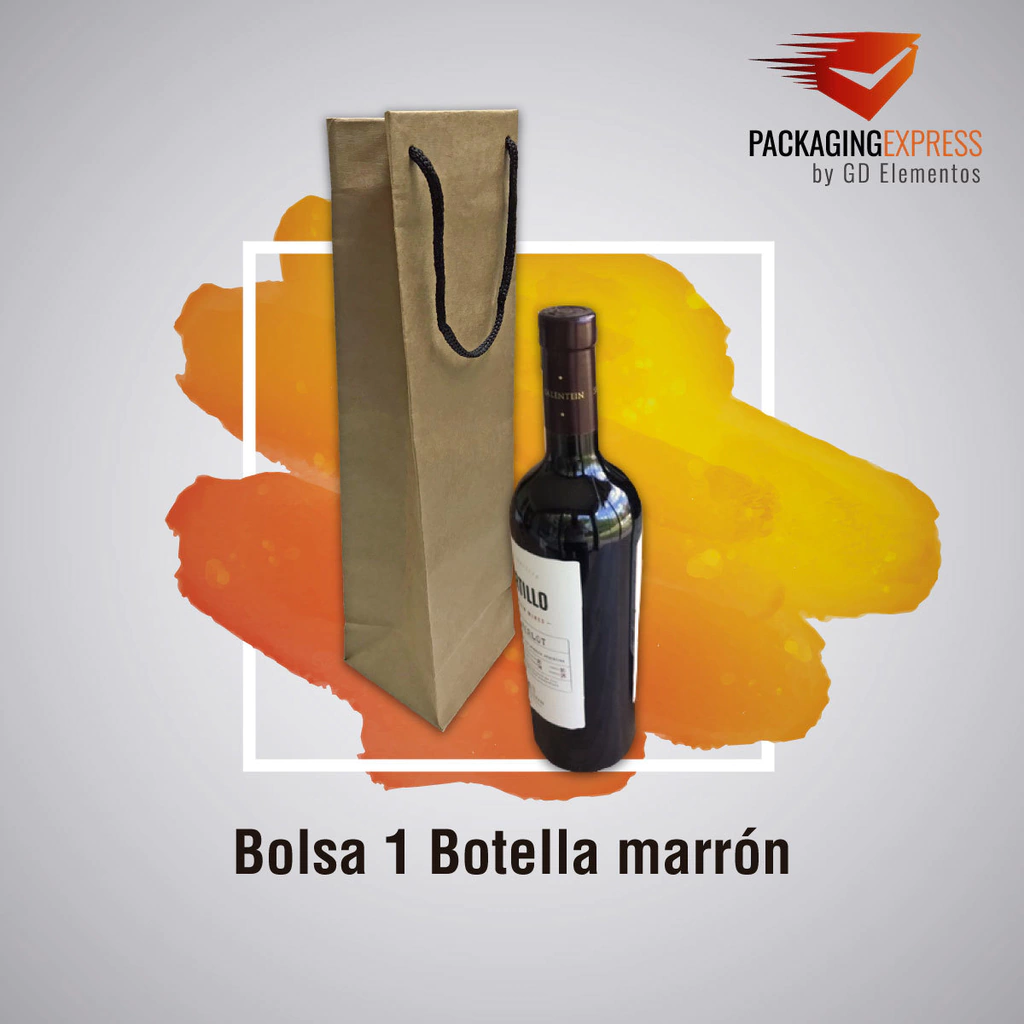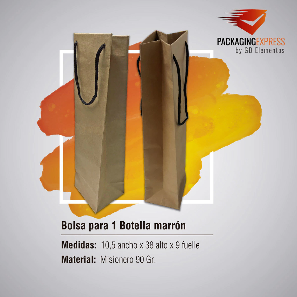 Bolsa con Manijas para 1 Botella de Vino, Bebidas Muy Resistentes Refuerzo de cartón en Base y Manijas. Kraft Marrón