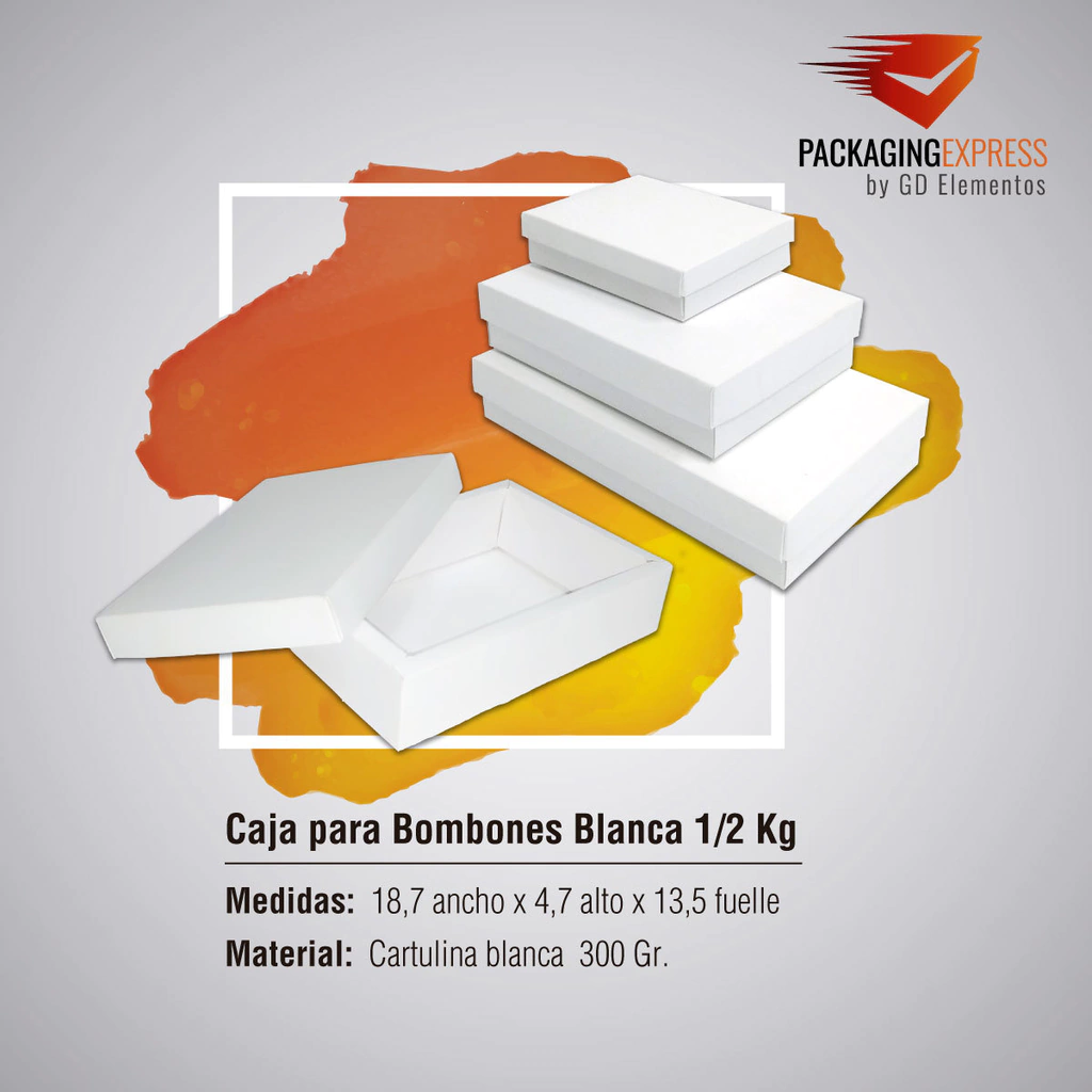 Caja Base y Tapa en 2 piezas Para Bombones, Chocolates de 1/2 Kg Pared Doble. Cartulina Blanca